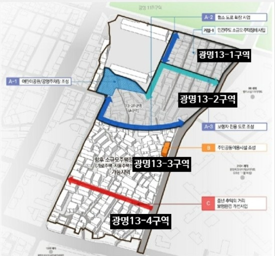 4)광명사거리 남단으로 고층 대단지 아파트가 13구역을 둘러싸고 있어 구역 전체를 하나로 개발하는 대단지 아파트를 조성해야 한다”며 “현재 공공재개발 준비위는 GH에 광명13구역 전체를 개발하는 사업성 검토 요청을 했고 결과를 기다리고 있다고 합니다.(코리아드림,광명일보,인천일보 기사 참조)