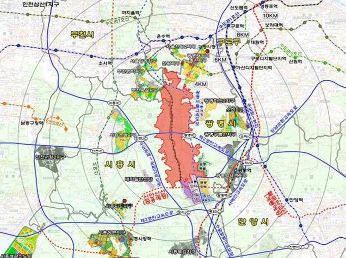 -광명시 광명·옥길·노온사동 및 시흥시 일부 포함, 면적 약 1,271만㎡ (384만평), 약 70,000호 예정